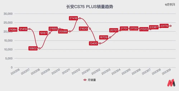 例如在新能源大行其道的当下,长安品牌的拳头产品依旧是只有燃油动力可以选择的CS75 PLUS,其月销量趋势依旧非常稳定。(也从侧面说明新能源车迄今为止并没能“取代”燃油车)