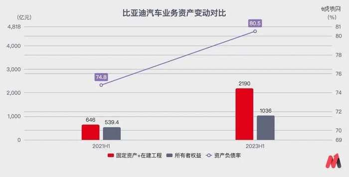 极低的利润水平之下,比亚迪还在自身所有者权益仅增长了不到500亿元的前提下,比亚迪在生产的厂房和设备等固定资产上,新增了超过1500亿元的投资,一口气将自己的资产负债率抬升到了超过80%的水平。