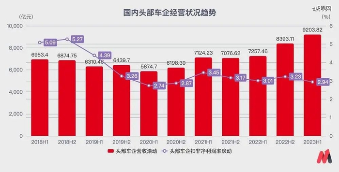 以国内去年乘用车市场总体占比超50%的6家头部车企(均为上市企业),比亚迪、吉利汽车、长城汽车、上汽集团、长安汽车、广汽集团的合并经营状况为例。从2018年至今,其营收规模增长了超过30%,利润反而下降了37%,相当于利润率下滑了42%。