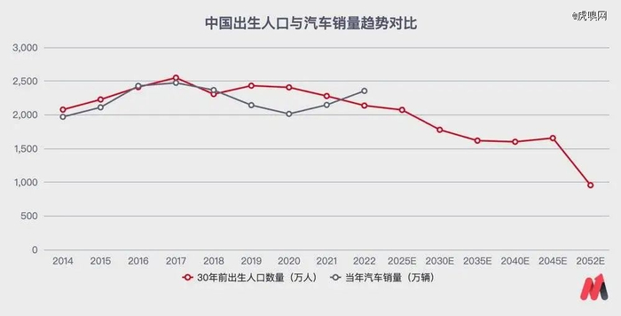 不仅2014-2018年的曲线高度重合,就连2019年之后疫情影响,以及新能源技术革命的趋势都高度吻合。真正关键的在于未来,已知国内1992年后出生人口的持续下降,哪怕去年首次跌破1000万的出生人口数字,很可能要到2052年前后才会真正产生影响,但中国汽车本土市场向存量、总量持续萎缩模式转型的趋势已经确立。