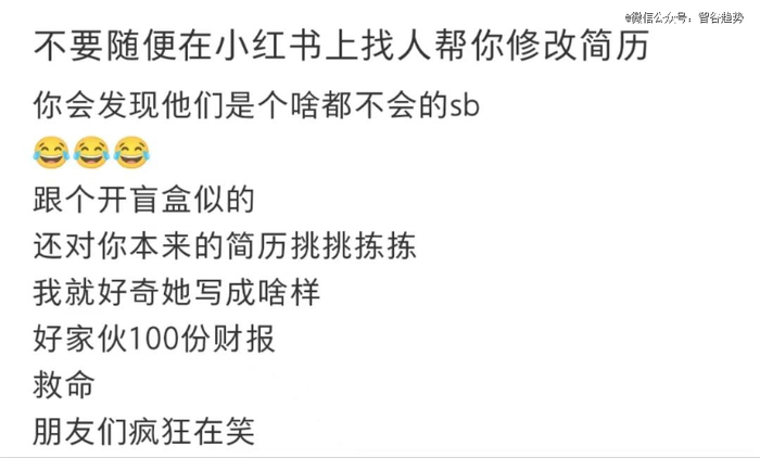 有人提及当自己得知还有简历优化师的存在时,他的*反应是“得救了”。