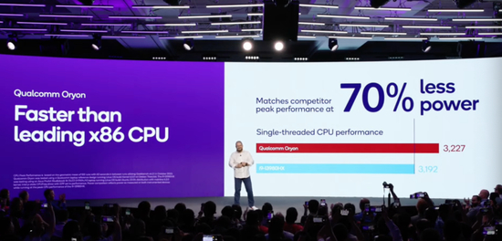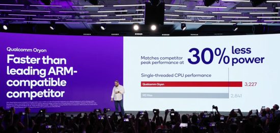 ‘赶紧拍照。’高通 CEO 安蒙在峰会上称,Oryon CPU 的单线程性能超过了苹果的 M2 Max 和英特尔的 i9-13980HX,峰值性能功耗比 M2 Max 少 30%,比 i9-13980HX 少 70%。