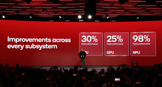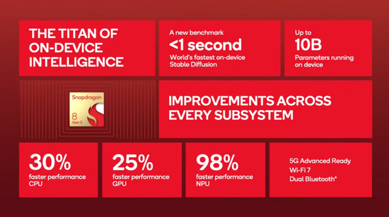 相比上一代,第三代骁龙 8 的 CPU 性能提升了 30%,GPU 性能提升了 25%,NPU 性能则提升了 25%,支持运行 100 亿参数的生成式 AI 模型。据称在智能手机设备上运行Stable Diffusion,只需不到 1 秒就可以用文本生成图像。
