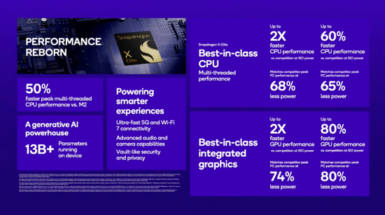 专为 AI 打造的骁龙 X Elite,集成了全新定制的高通 Oryon CPU,支持在终端侧运行超过 130 亿参数的生成式 AI 模型,处理速度是竞品的 4.5 倍,面向 70 亿参数大模型时每秒可生成 30 个 token。据高通称,这款移动计算 CPU 的性能是竞品的两倍,在达到相同峰值性能时,功耗仅为竞品的三分之一。
