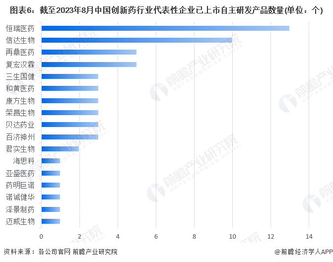 从已上市自主研发产品数量情况来看,截至2023年8月,恒瑞医药、信达生物已上市自主研发产品数量较多,分别为13个和10个。