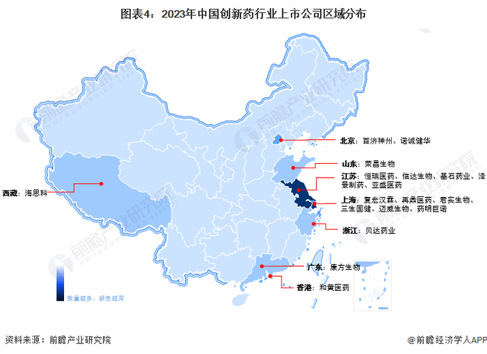 从创新药上市企业区域分布情况来看,创新药上市企业主要分布在东部沿海地区,并且在长三角一带聚集,尤其以江苏省和上海市为代表,上海市创新药上市企业有复宏汉霖、再鼎医药、君实生物、三生国健、迈威生物、药明巨诺等;江苏省创新药上市企业有恒瑞医药、信达生物、基石药业、泽景制药、亚盛医药等。