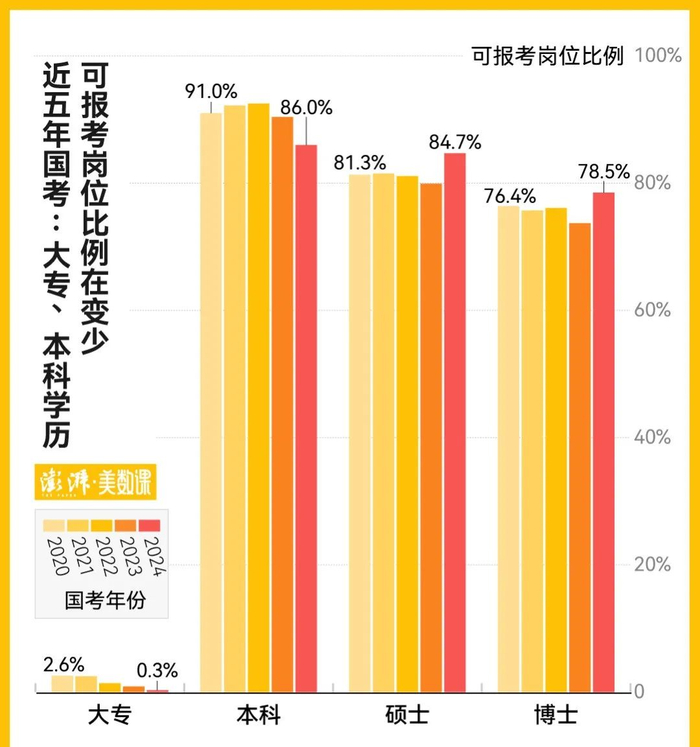 据澎湃新闻统计,自2020年至2024年,大专学历可报考的职位占总职位的比例从2.6%下降至0.3%,仅限硕士博士学历的岗位从4%左右增加到6.8%。