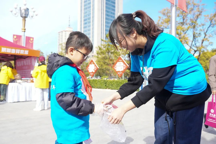 小小志愿者们每人手中一个塑料袋,一边进行着爱老敬老倡议书和甜蜜交换活动,一边将现场的垃圾默默拾起。他们用自己的行动,诠释了这场活动的主题。