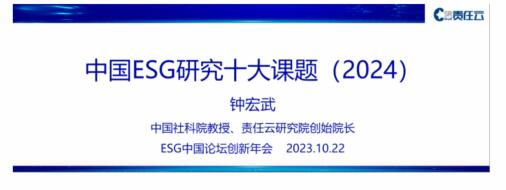 值得一提的是,为更好推进中国ESG体系建设,推动企业提升ESG工作水平,在本次论坛上,中国社科院教授、责任云研究院院长钟宏武还发布了《中国ESG研究十大课题(2024)》,旨在动员和推动各方力量加强ESG前沿问题研究,并在下年度“ESG中国论坛创新年会”上发布课题成果,系列推出新一版“中国ESG研究十大课题”。