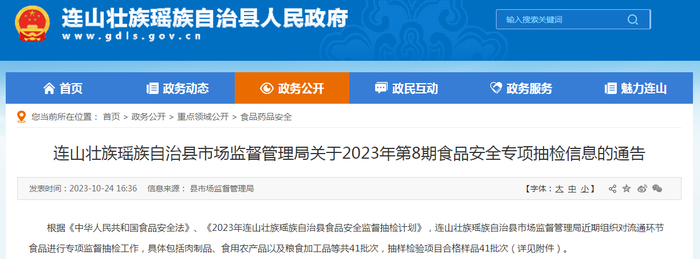中国质量新闻网讯 近日,广东省连山壮族瑶族自治县市场监督管理局发布关于2023年第8期食品安全专项抽检信息的通告。