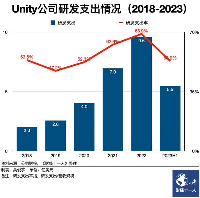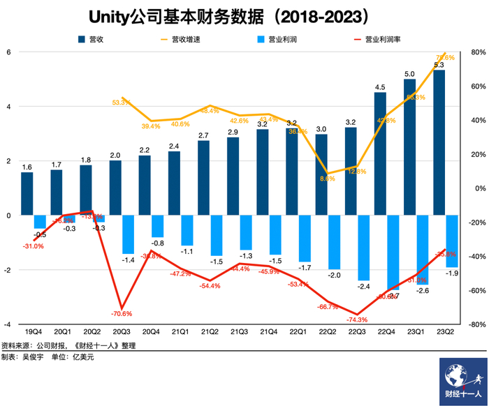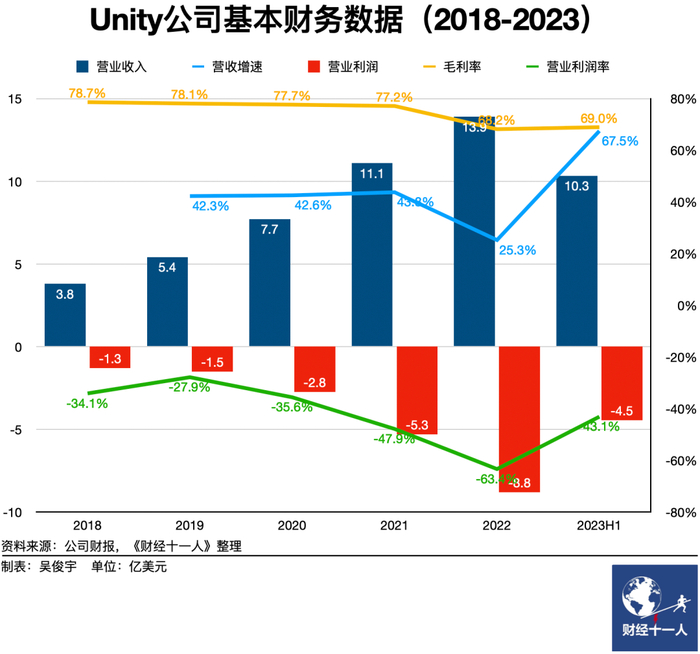 Unity 2023年中期业绩显示,上半年营收10.3亿美元,同比增长67.5%;营业亏损4.5亿美元,营业亏损43.7%。从披露财务数据的2018年后,Unity营业亏损率长期在30%以上,亏损比例持续扩张。