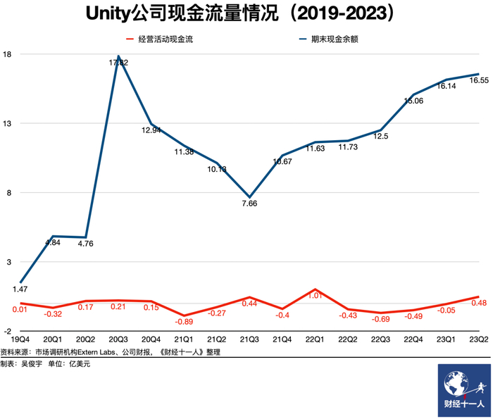 事实上,无论从营业利润、经营活动现金流视角看,Unity都不算是一家足够健康的SaaS企业。Unity现金流并不宽裕,其经营活动现金流相对紧张,多个季度出现经营活动现金流为负的情况。