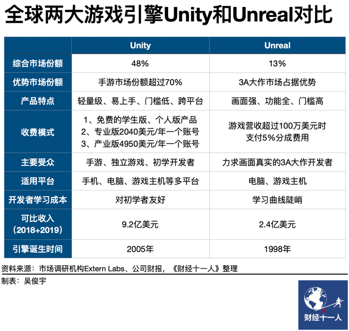 轻量级、易上手、价格低是Unity获得游戏引擎市场半壁江山的主要原因。其定价远低于竞争对手Unreal。