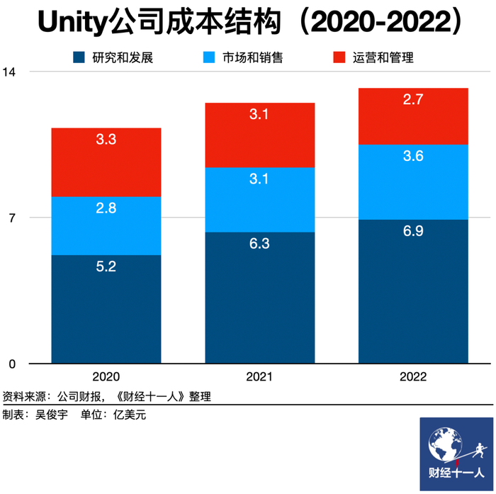 这些业务的确和Unity强相关,但每一个新的软件业务、行业业务,都意味着需要高昂的研发投入。成熟期软件公司通常研发支出率在20%以下,但Unity研发支出率长期高于50%。研发成本是Unity公司成本结构中最大的部分。