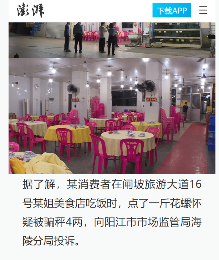 10月24日晚,“海陵融媒”发布报道称,阳江市市场监管局海陵分局根据消费者投诉“一斤花螺怀疑被骗秤4两”的情况,对位于闸坡旅游大道16号的某姐美食店进行查处。通过询问该大排档的负责人和员工,初步核查为员工在秤量花螺时没有消除盛装花螺的胶桶重量,没有做到“裸秤”。