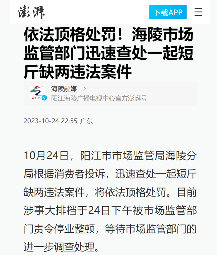 当地政府相关部门回应,将强力整治“缺斤短两”违法行为。十月小长假期间,不少网络视频反映海陵岛客流量少、生意清淡,甚至有商家举牌自证绝不缺斤少量。即便如此,10月15日,仍有媒体曝出闸坡一夜埕海产品特色街一商铺以1.2两的包装替代原来的塑料盒的短斤缺两情况。据报道,该商铺已受到处罚。诚信漩涡中的海陵岛现状如何?近日,读特融媒体记者前往海陵岛暗访调查,就缺斤少两、公平秤使用、商家处罚等情况一探究竟,并在读特新闻客户端推出系列报道。