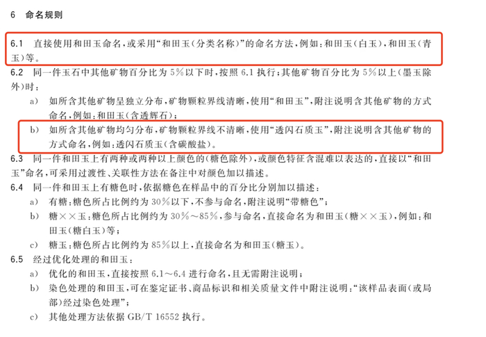 在命名规则一栏,6.1、6.2显示,同一件玉石中其他矿物百分比为5%以下时,可直接使用和田玉命名。同时,6.2及6.2 b显示,其他矿物百分比为5%以上(墨玉除外)时,如所含其他矿物均匀分布,矿物颗粒界限清晰,使用“透闪石质玉”,附注说明含其他矿物的方式命名,例如:透闪石质玉(含碳酸盐)。