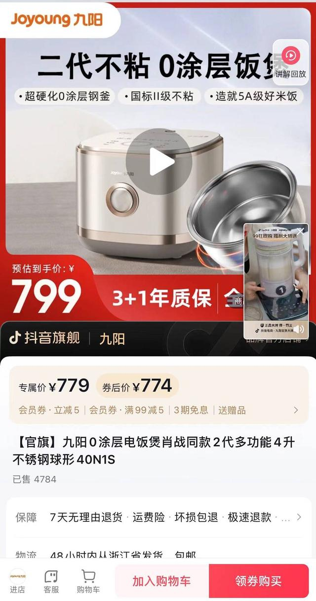 “家里以前的电饭煲旧了,里面涂层一块块的掉,不仅难清洗,我们也担心不小心吃进肚子,对小孩、老人身体有影响。”经多方比较,王先生在多个品牌中挑选了一款“九阳0涂层”的电饭煲,并在其抖音官方直播间以774元的价格优惠下单购买。