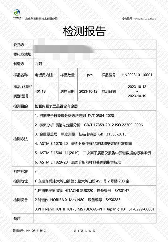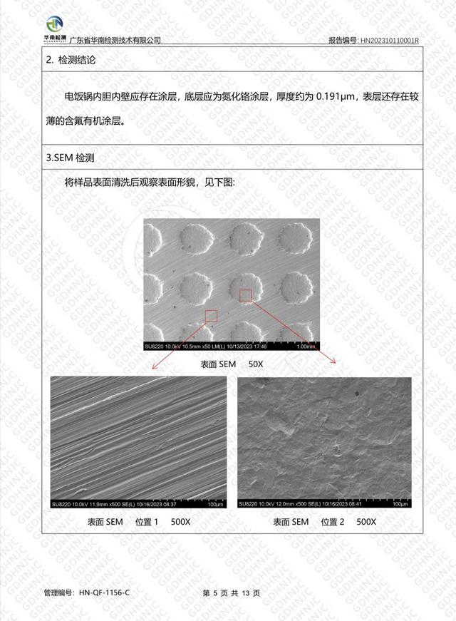 为了证明谁是对的,他和朋友一合计,便把电饭煲拿去送检。几天后,王先生收到了检测报告。该检测报告由广东省华南检测技术有限公司出具,检测报告结论显示,“电饭锅内胆内壁应存在涂层,底层应为氮化铬涂层,厚度约为0.191μm,表层还存在较薄的含氟有机涂层。”