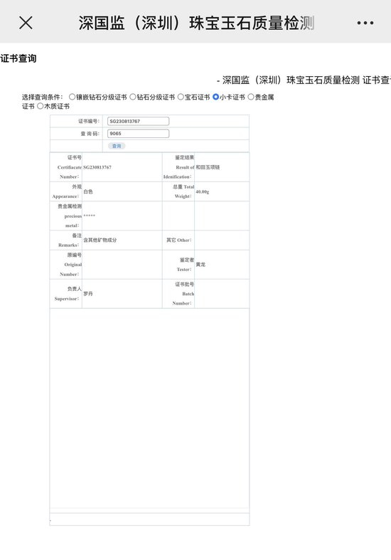 第一财经尝试扫描商家所提供证书上的二维码,显示鉴定结果为“和田玉项链”,并且含有其他矿物成分。