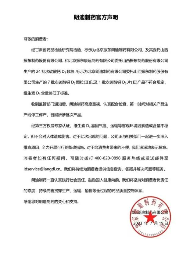 7月19日,朗迪制药于官网发布致歉声明称,所涉产品不符合规定是由于维生素D3含量略低于标准,并表示公司在收到监管部门通知后,已对相关产品生产线停工停产,召回不符合规定的批次产品。