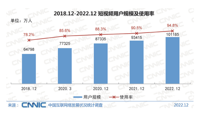 中国互联网络信息中心发布的《第51次中国互联网络发展状况统计报告》显示,截至2022年12月,我国短视频用户规模10.1亿,同比增长8.3%,用户使用率高达94.8%,短视频成为全民化应用;同时,随着行业的发展,短视频内容不断丰富,带动用户规模增长和黏性加强,成为移动互联网时长和流量增量的主要来源。