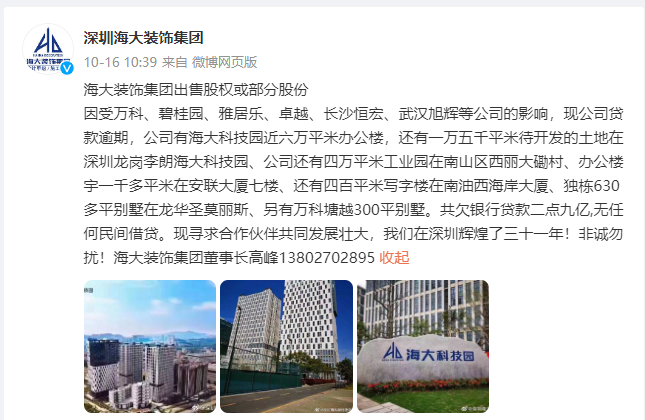 近日,一张“深圳海大装饰集团董事长发朋友圈出售股份救急”的图片在网络传播,引发关注。图片内容称,“因受多家房企影响,海大装饰集团贷款逾期,共欠2.9亿元,现出售股权或部分股份。”落款为海大装饰集团董事长高峰。为此,证券时报记者就此联系海大装饰集团董事长高峰并进行采访。
