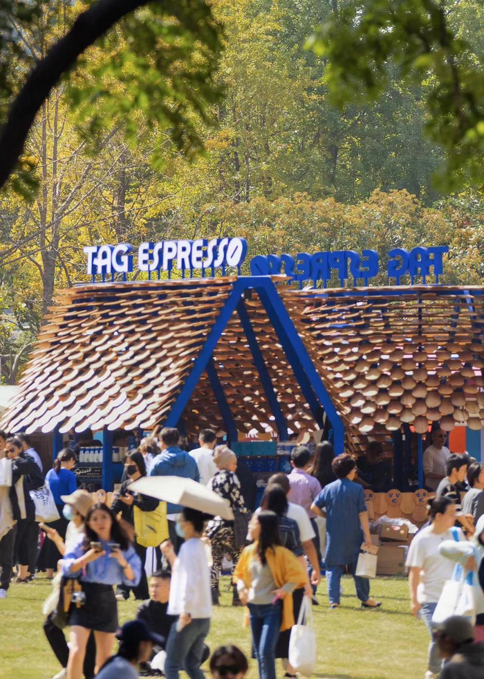在中心绿地主舞台的前方,有一个极具设计感和可持续性的展台,这是来自狮城新加坡的TAG ESPRESSO。它成立于2021年,两年多便已在新加坡和中国拓展了二十多家门店,表现出年轻蓬勃的生命力。品牌自创立之初便力图揭掉咖啡的固有标签,将潮流文化注入其中,强化“潮流艺术咖啡”的定位标签,从此次参加陆家嘴咖啡节的展台设计中便一目了然。