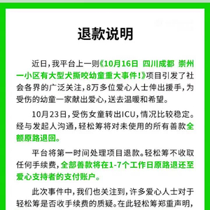 【#被狗咬女童200万捐款基本退完#家属:恩情永远铭记】10月26日,轻松筹平台显示,目前被狗咬女童的200万捐款已基本退完,仅剩2人的30元善款长时间未能退回。10月16日,成都崇州一名2岁女童被罗威纳犬咬伤,家属在轻松筹平台上发起筹款,约6小时便筹够200余万元。此后由于种种原因,该事件陷入争议,上千名捐款者主动发起退款申请。10月25日,轻松筹平台发布退款声明,称女童转出ICU,情况比较稳定。经与发起人沟通,未使用的所有善款将于1-7个工作日全额原路退还,并重申轻松筹不收取手续费、服务费。之后,女童母亲解释了筹款200万的原因,并再次感谢大家危难之际伸出援手,这份恩情永远铭记。#被狗咬女童200万捐款已基本退完#(北京青年报编辑翟雷涛)