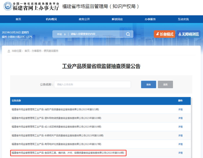 中国质量新闻网讯 近日,福建省市场监督管理局网站刊登工业产品-食品用工具、编织袋、片材、容器质量省级监督抽查结果公告(2023年第016期)。