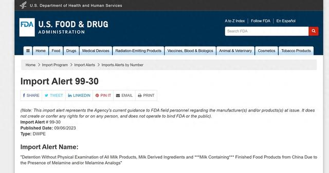 记者查阅美国FDA官网看到,目前美国对中国的进口警报涉及三聚氰胺的共有三项,都是从2008年发布,在之后陆续进行过修订,但一直没有取消,警报显示,所有来自中国的奶制品和含有乳源成分的食品,比如饼干、蛋糕、软糖等,也都在进口警报范围中。