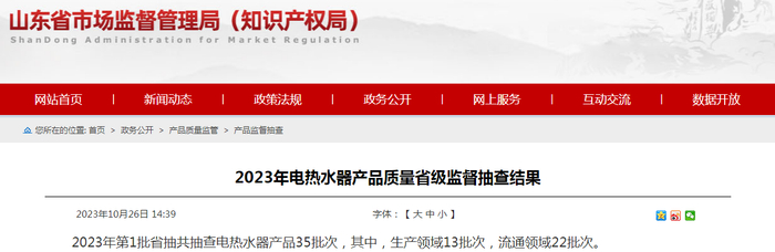 中国质量新闻网讯 2023年10月26日,山东省市场监督管理局网站发布2023年电热水器产品质量省级监督抽查结果。2023年第1批省抽共抽查电热水器产品35批次,其中,生产领域13批次,流通领域22批次。