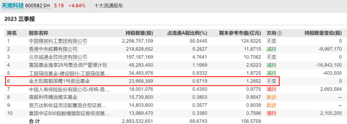 此外,邱国鹭管理的金太阳高毅国鹭1号崇远基金三季度持有天地科技2366.84万股,与上季度保持不变,期末持股市值为1.29亿元。