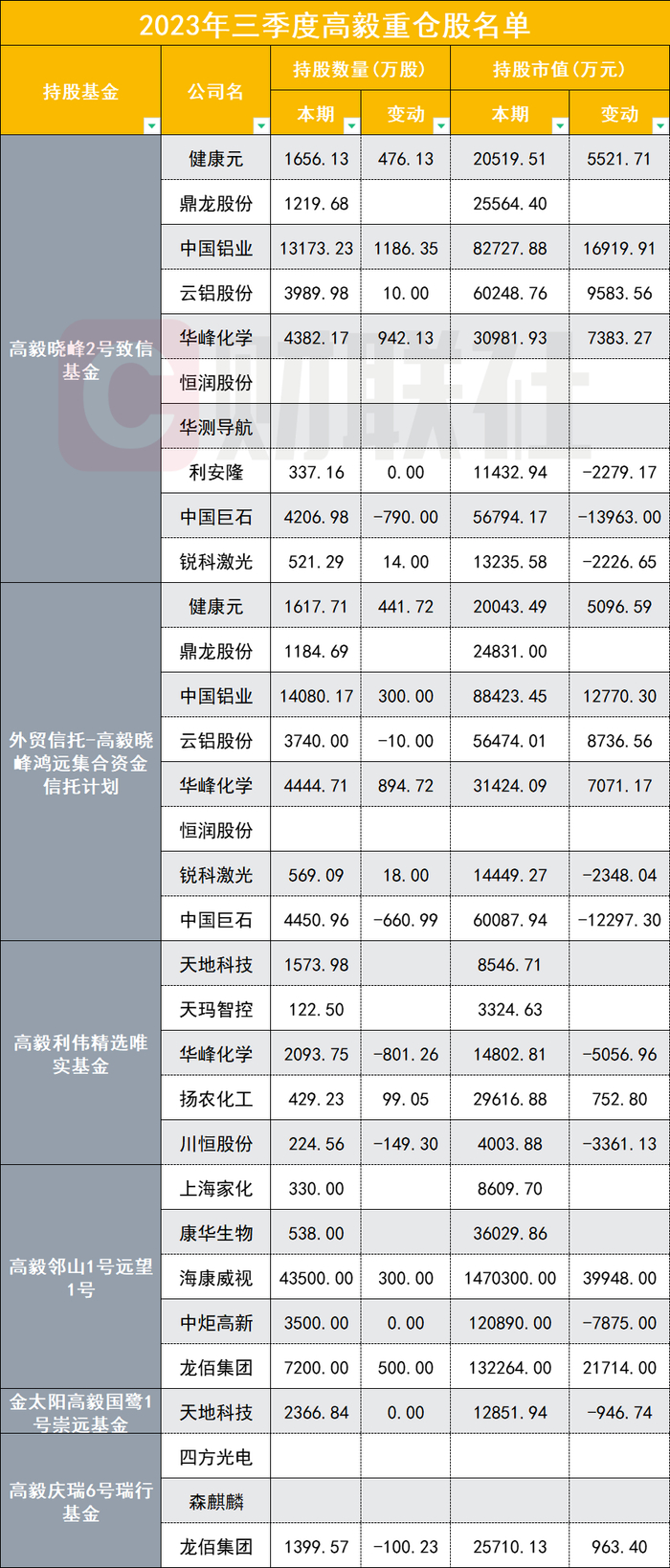 上述两只产品三季度增持中国铝业1486.35万股,持股数达2.73亿股,期末持股市值达17.12亿元。同期,邓晓峰增持华峰化学1836.85万股,持股市值达6.24亿元;小幅加仓锐科激光32万股,持股市值为2.77亿元。邓晓峰还在今年三季度减持中国巨石约1451万股持股总市值为11.69亿元。