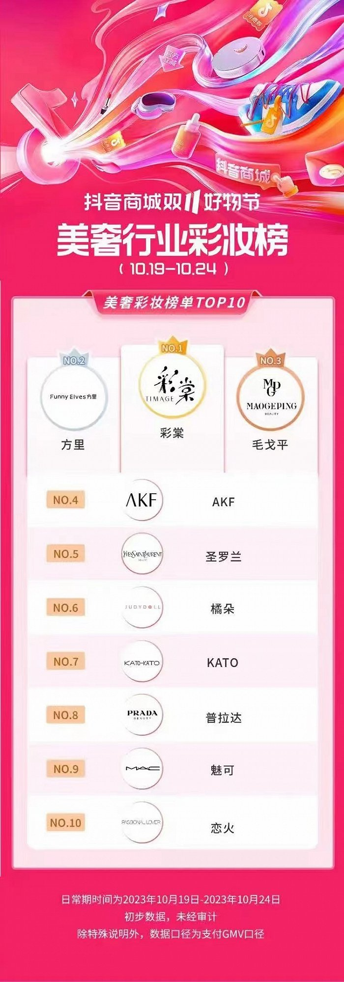 抖音平台的前三名则被国货彩妆包揽,彩棠之后位列第2、3名的是被薇诺娜母公司贝泰妮集团收购的方里Funny Elves,以及毛戈平。