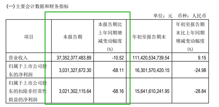 三季度,通威股份营业收入373.52亿元,同比下滑10.52%,净利润为30.31亿元,同比下滑68.11%,系2016年一季度以来的最差单季表现。