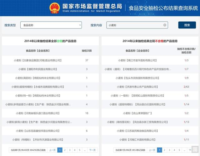 在国家市场监督管理总局食品安全抽检公布结果查询系统中搜索“小麦粉”,结果显示,合格产品有4292条,不合格产品仅有53条。