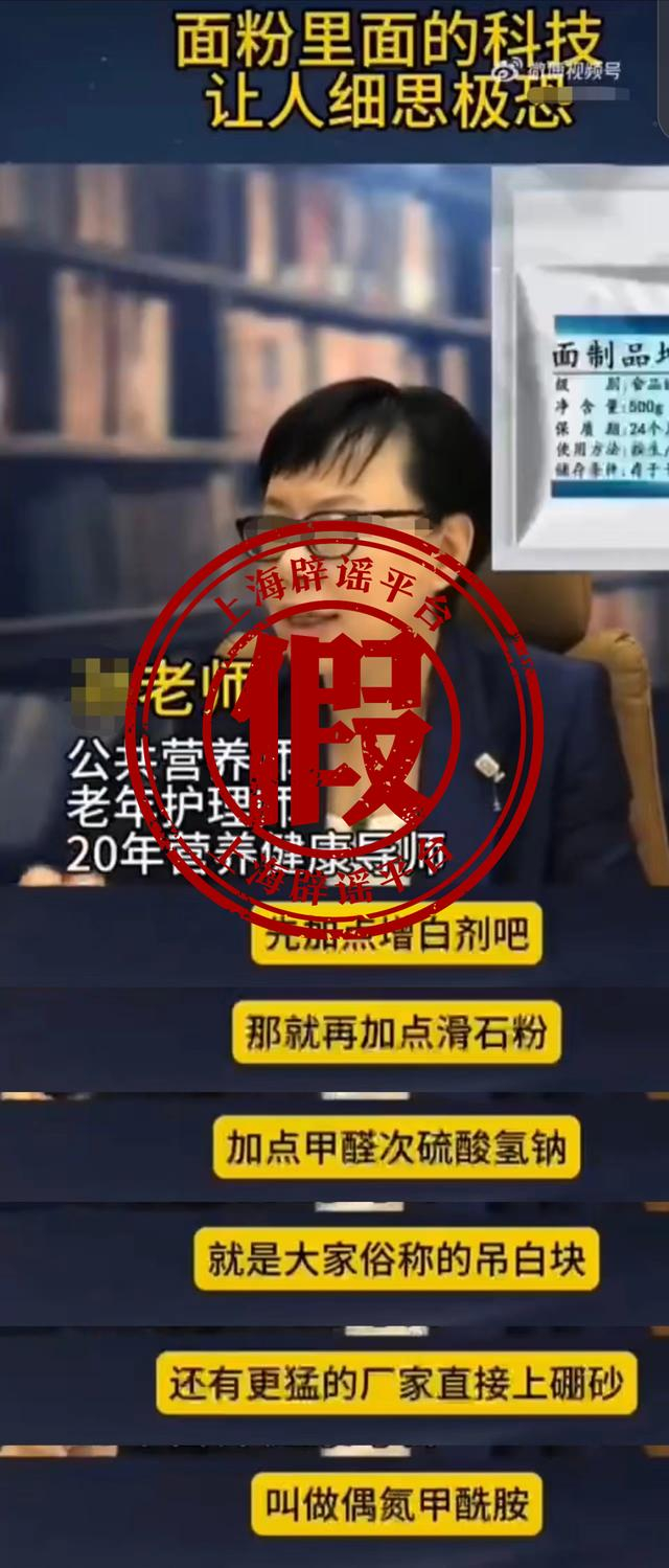 例如,近日网上流传的一段视频中,一位标注为“**老师”的主播说:“面粉中含有增白剂、滑石粉、甲醛次硫酸氢钠(吊白块)、硼砂、偶氮甲酰胺等多种添加剂,让人细思极恐。”