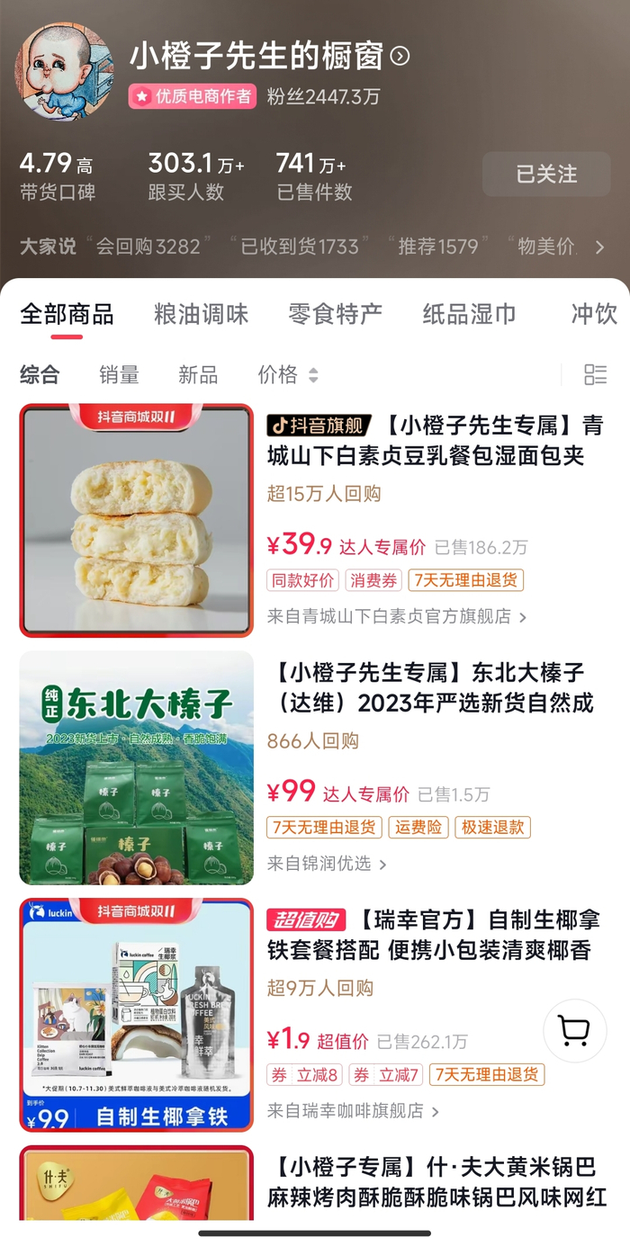 另一边,“小橙子先生”的一场直播中,则是他的爸爸在售卖玉米,29.9元的玉米套装,在数千人的见证下顷刻售完。