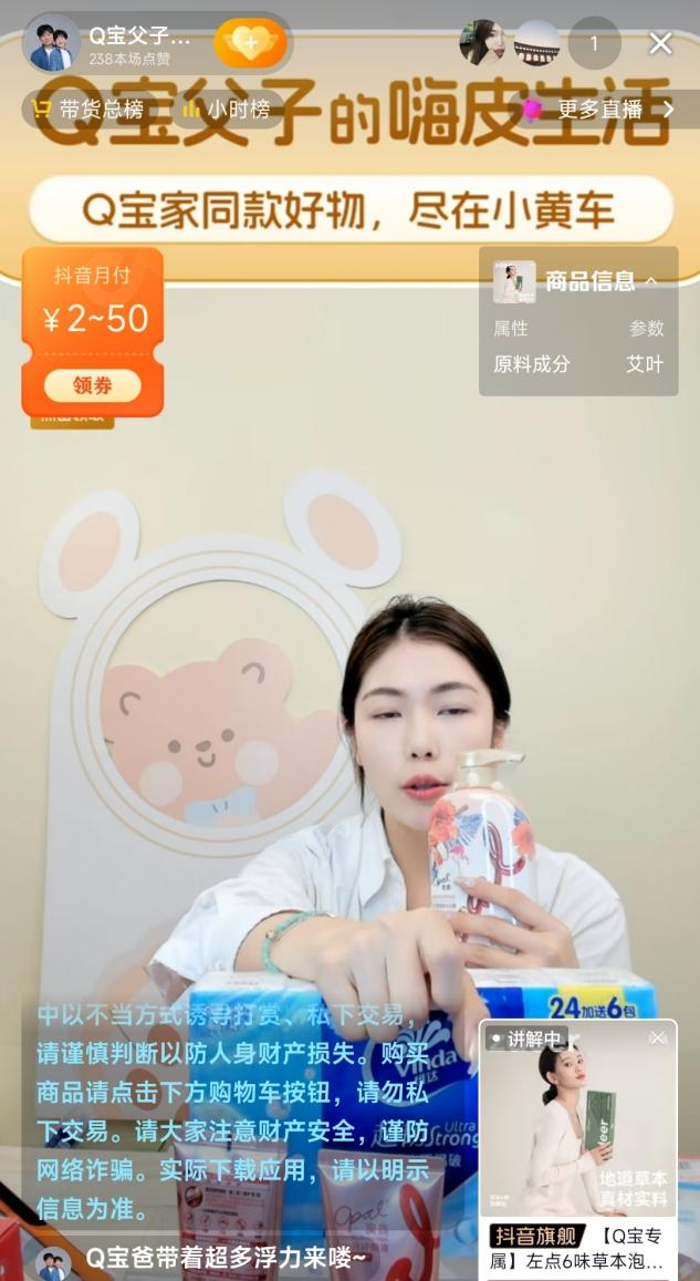 与前两种直播相比,这种不使用萌娃账号,而是家长另开新号直播。比如,潘哥发现,萌娃“Q宝”走红后,家长开设了“Q宝父子的快乐生活”抖音账号,开始用该账号带货直播,但是人气似乎有些不足。