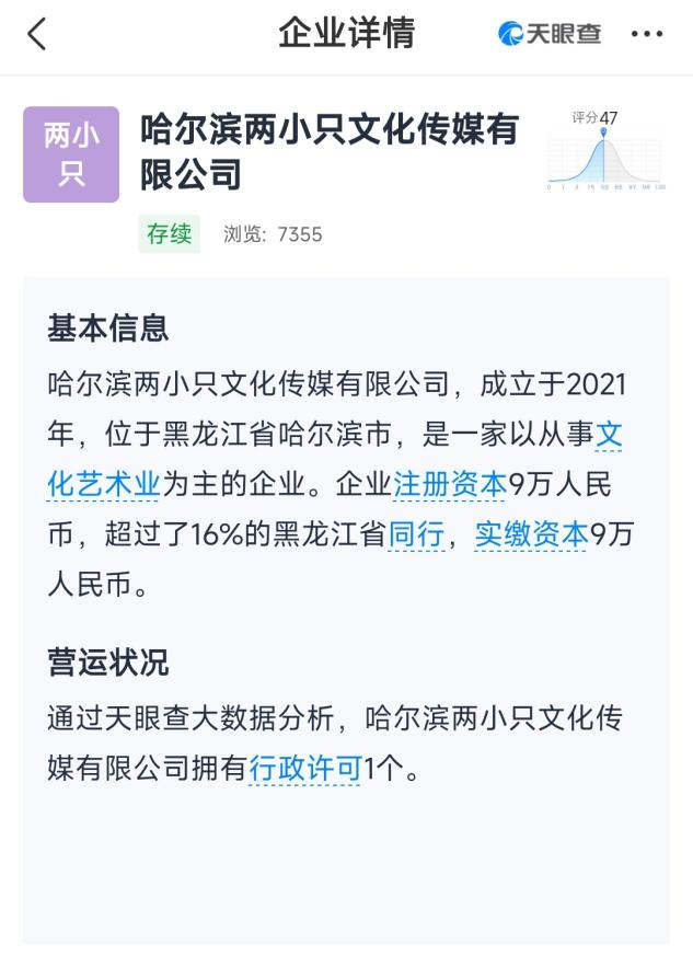 而博主“朱两只吖”,则成立了自己的MCN机构:两小只传媒,天眼查App显示:其背后的哈尔滨两小只文化传媒有限公司,成立于2021年。
