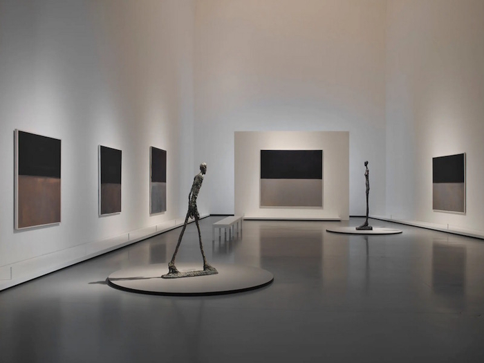 1969-1970年间,罗斯科的方形和矩形画作被缩减为简单的两段式构图,深沉浓郁的黑色覆盖在更明亮的灰色之上。展览现场,五幅罗斯科的《无题》 油画。展厅中央,贾科梅蒂作品