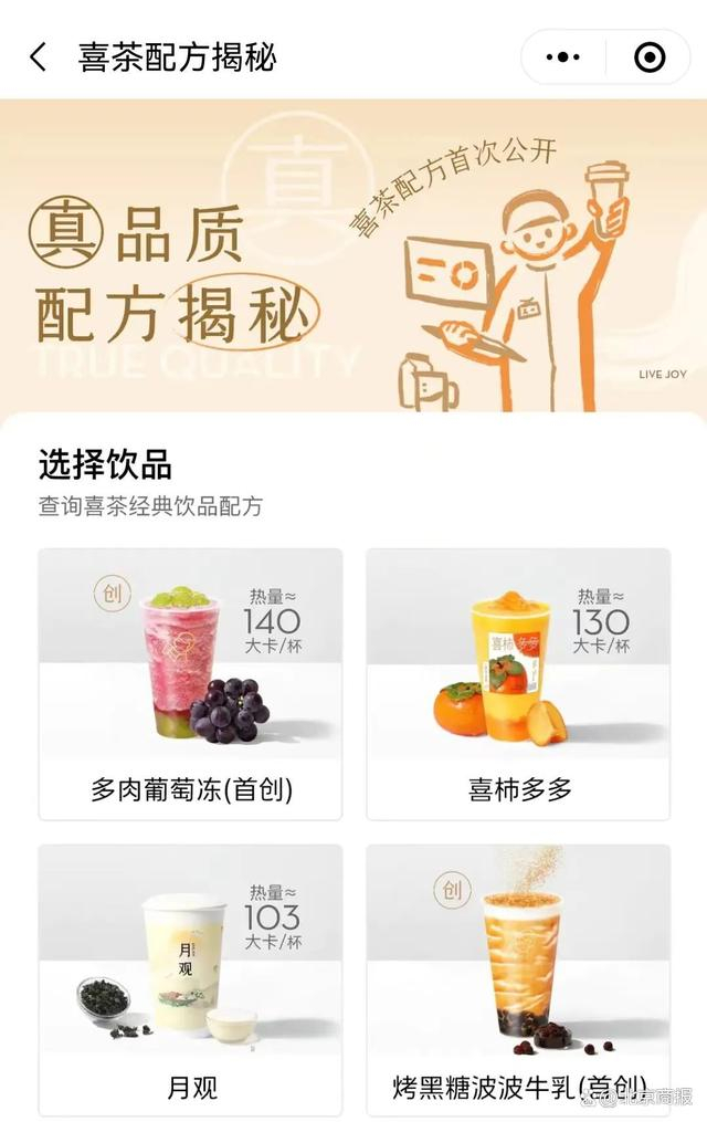 这次的喜茶动了真格,除了产品热量和成分之外,还附上三方检测报告。北京商报记者在上述小程序中看到,首页已经增加了“配方原料揭秘”入口。以饮品月观为例,一杯月观中含有103大卡热量、4.4g蛋白质和5.5g脂肪等,热量和一颗苹果的热量相当。对这些产品的营养成分信息,喜茶还在下方附上了第三方专业机构的营养成分权威检测报告。