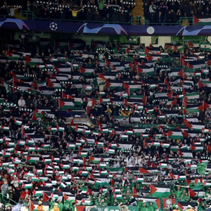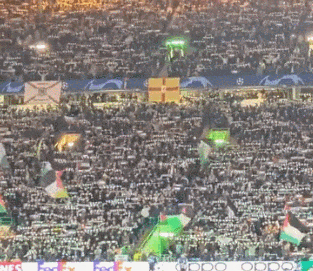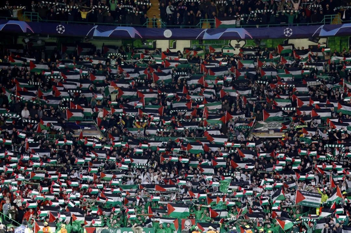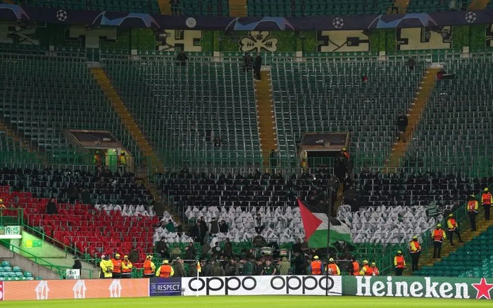 尽管凯尔特人足球俱乐部在赛前发出“禁令”,但综合英国广播公司(BBC)、《镜报》等25日报道,当地时间周三晚进行的欧洲冠军联赛小组赛上,数万名凯尔特人球迷仍在主场凯尔特人公园球场集体举起或挥舞巴勒斯坦国旗,并高唱《你永远不会独行》(You'll Never Walk Alone)、《啊,朋友再见》(Bella Ciao),以示对巴勒斯坦人民的声援。