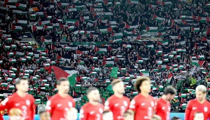在球队入场前,数万名球迷集体举起或挥舞巴勒斯坦国旗,并高唱《你永远不会独行》,以及二战期间在整个欧洲战场流传极广的意大利游击队之歌《啊,朋友再见》。