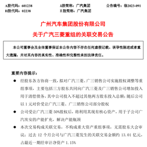 10月24日晚间,广汽集团发布公告称,董事会审议通过了《关于广汽三菱重组的关联交易公告》,拟对广汽三菱、广汽三菱汽车销售公司实施股权调整等重组事项。广汽集团将以1元对价受让三菱自动车工业株式会社、三菱商事株式会社持有的广汽三菱30%、20%股权,广汽三菱将成为广汽集团全资子公司,广汽埃安将利用广汽三菱工厂实现增产扩能。