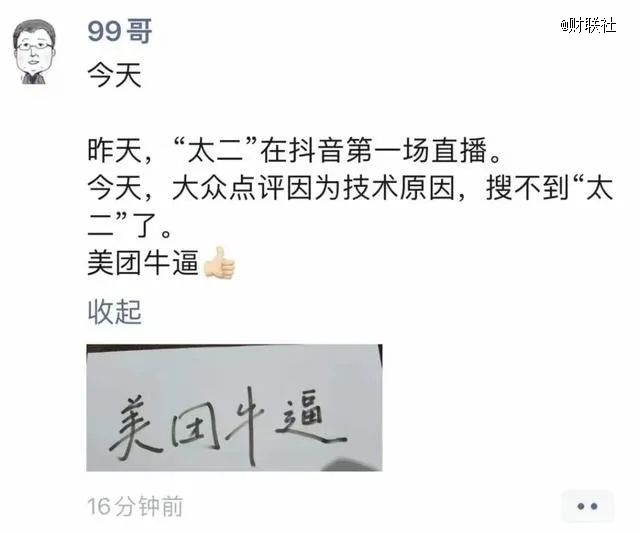 另有爆料称,九毛九集团创始人管毅宏,在个人朋友圈发文称“昨天,太二在抖音*场直播;今天,大众点评因为技术原因,搜不到太二了,美团牛逼”。