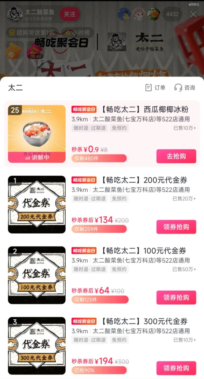 值得注意的是,虽然太二酸菜鱼并未在美团开播,但却曾推出外卖折扣券,并多次被在美团官方直播间推销。