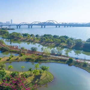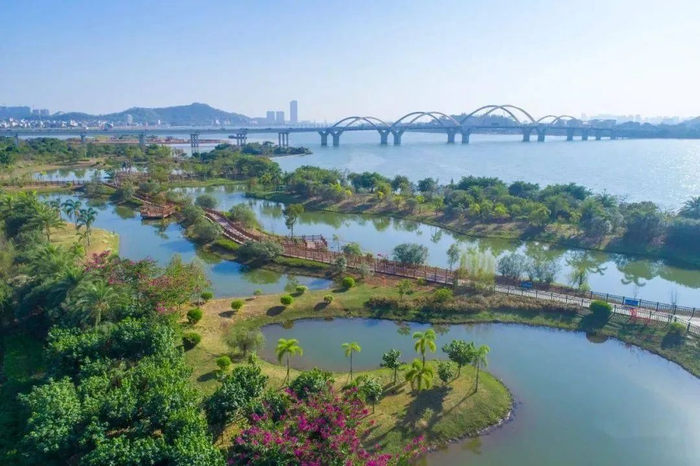 潮州湘桥韩江金山大桥市级湿地公园位于潮州市韩江东岸意东堤金山大桥下的滩地和水域,总面积约30公顷,包括江中的湿地公园主园区和意东堤边金山大桥下的副园区。作为“一江两岸”城市景观,公园的优美环境受到广大游客的一致点赞。湿地公园于2021年年底被评为韩江八景之一,命名为“鳄渚云烟”。