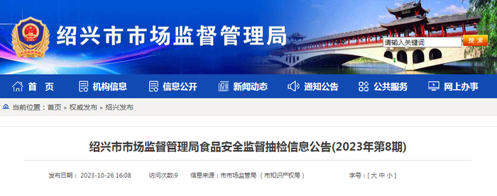 浙江省绍兴市市场监管局发布食品安全监督抽检信息(2023年第8期)